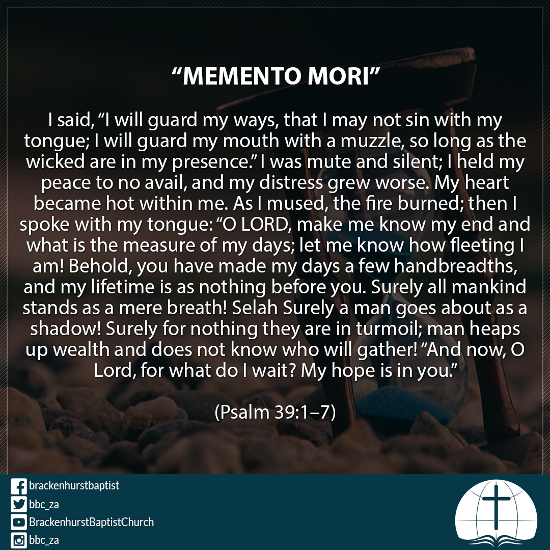In ancient Israel, Psalm 39 served as a memento mori—a reminder of human mortality. “Oh LORD, make me know my end and what is the measure of my days; let me know how fleeing I am!” (v. 4). David understood the brevity of life and the insignificance of humanity in comparison to God’s eternality and glory. We tend to avoid the uncomfortable thought of death; David knew that godly wisdom sees life in the context of death. “Behold, you have made my days a few handbreadths, and my lifetime is as nothing before you. Surely all mankind stands as a mere breath! Selah. Surely a man goes about as a shadow! Surely for nothing they are in turmoil; man heaps up wealth and does not know who will gather!” (vv. 5–6). He knew that “all mankind is a mere breath” (v. 11) and that humans are mere “sojourners” and “guests” with God (v. 12) until they “depart and [are] no more” (v. 13). His reflections on death helped him to properly evaluate life.